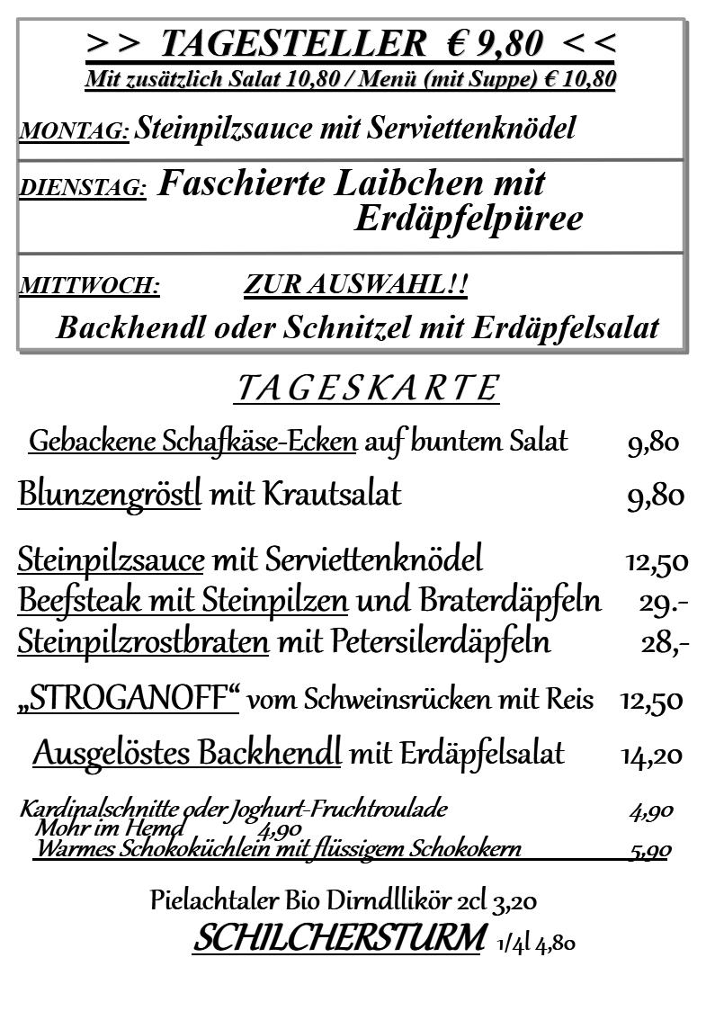Unsere reichhaltige, kunterbunte Speisekarte beinhaltet Traditionelles-Bodenständiges genauso wie auch unterhaltsam Abwechsungsreiches und wird von ständig wechselnden saisonellen Tagesangeboten ergänzt.