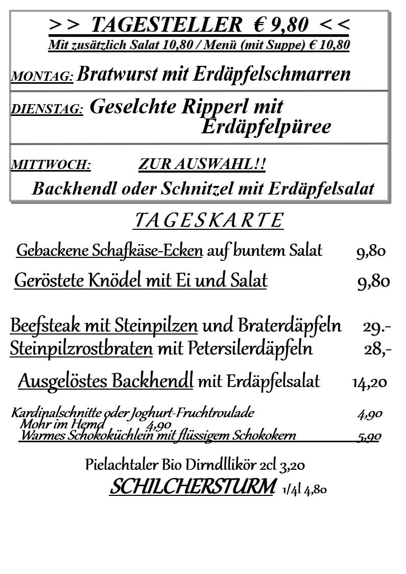 Unsere reichhaltige, kunterbunte Speisekarte beinhaltet Traditionelles-Bodenständiges genauso wie auch unterhaltsam Abwechsungsreiches und wird von ständig wechselnden saisonellen Tagesangeboten ergänzt.