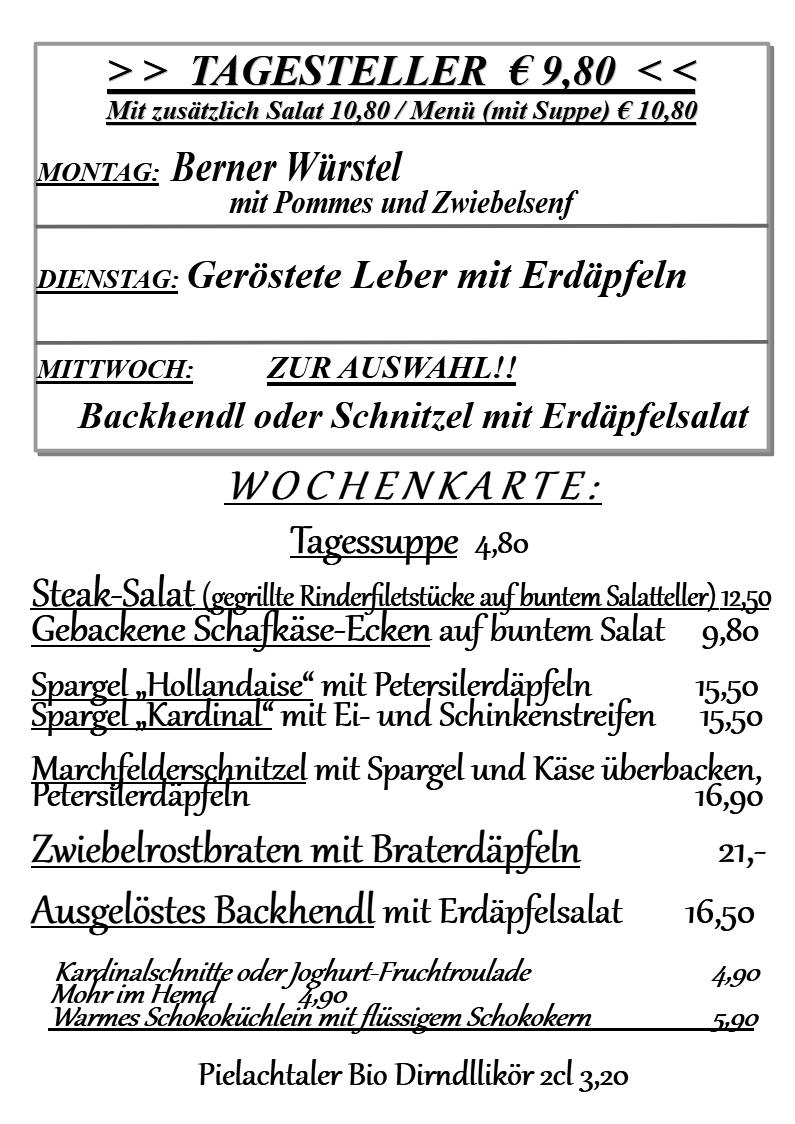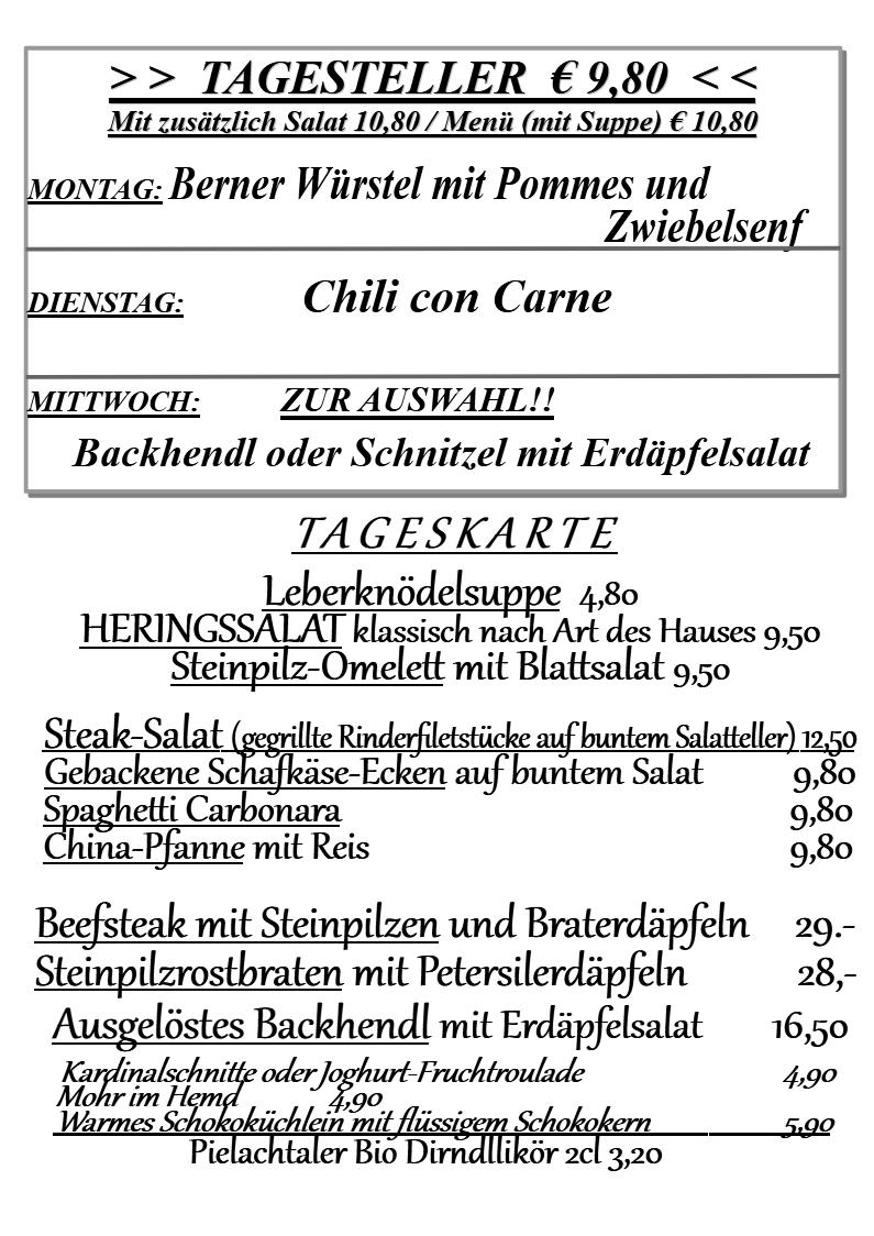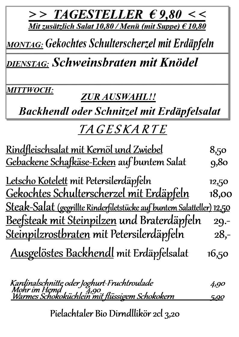 Unsere reichhaltige, kunterbunte Speisekarte beinhaltet Traditionelles-Bodenständiges genauso wie auch unterhaltsam Abwechsungsreiches und wird von ständig wechselnden saisonellen Tagesangeboten ergänzt.